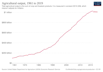 By 2015, the agricultural output of China was the largest in the world, followed by the European Union, India and the United States.[105] Economists measure the total factor productivity of agriculture, according to which agriculture in the United States is roughly 1.7 times more productive than it was in 1948.[106]