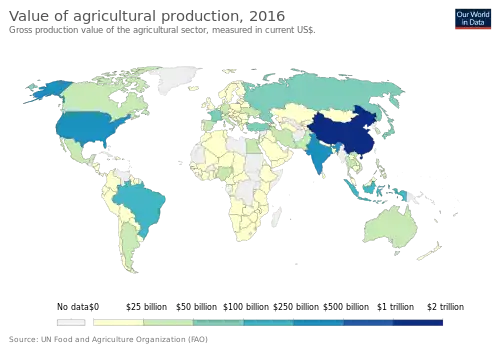 Largest countries by agricultural output (in nominal terms) according to IMF and CIA World Factbook, at peak level as of 2018