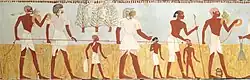 Egyptian society was highly stratified, and social status was expressly displayed. Farmers made up the bulk of the population, but agricultural produce was owned directly by the state, temple, or noble family that owned the land.[76] Farmers were also subject to a labor tax and were required to work on irrigation or construction projects in a corvée system.[77] Artists and craftsmen were of higher status than farmers, but they were also under state control, working in the shops attached to the temples and paid directly from the state treasury. Scribes and officials formed the upper class in ancient Egypt, known as the "white kilt class" in reference to the bleached linen garments that served as a mark of their rank.[78] The upper class prominently displayed their social status in art and literature. Below the nobility were the priests, physicians, and engineers with specialized training in their field. It is unclear whether slavery as understood today existed in ancient Egypt; there is difference of opinions among authors.[79]