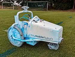 Previously, the lines were chalked by hand with a simple chalk machine, nowadays a programmable robot is used that draws all the lines on its own with spray paint.