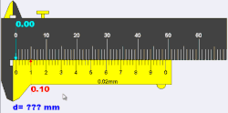 If when the jaws are closed the reading is 0.10 mm, the zero error is +0.10 mm. The method to use a vernier scale or caliper with zero error is to use the formula "(actual reading) = (main scale) + (vernier scale) − (zero error)", thus the actual reading is 19.00 + 0.54 − (0.10) = 19.44 mm. The resolution of the measurement, based on the width of the smallest sub-interval, is ±0.02 mm.