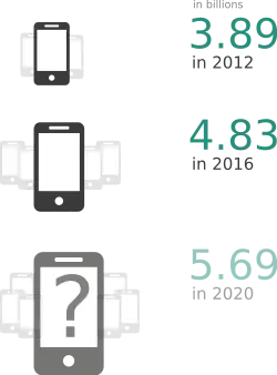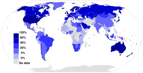 The International Telecommunication Union (ITU) estimated that, by the end of 2017, 48% of individual users regularly connect to the Internet, up from 34% in 2012.[79] Mobile Internet connectivity has played an important role in expanding access in recent years, especially in Asia and the Pacific and in Africa.[80] The number of unique mobile cellular subscriptions increased from 3.9 billion in 2012 to 4.8 billion in 2016, two-thirds of the world's population, with more than half of subscriptions located in Asia and the Pacific. The number of subscriptions was predicted to rise to 5.7 billion users in 2020.[81] As of 2018, 80% of the world's population were covered by a 4G network.[81] The limits that users face on accessing information via mobile applications coincide with a broader process of fragmentation of the Internet. Fragmentation restricts access to media content and tends to affect the poorest users the most.[80]