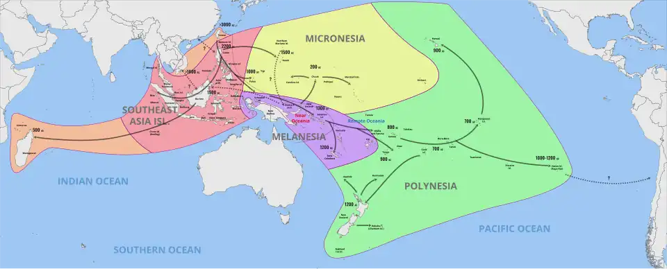 The Polynesian people are considered to be by linguistic, archaeological and human genetic ancestry a subset of the sea-migrating Austronesian people and tracing Polynesian languages places their prehistoric origins in the Malay Archipelago, and ultimately, in Taiwan. Between c. 3000 and 1000 BCE, speakers of Austronesian languages began spreading from Taiwan into Island Southeast Asia,[203][204][205] as tribes whose natives were thought to have arrived through South China c. 8,000 years ago to the edges of western Micronesia and on into Melanesia.