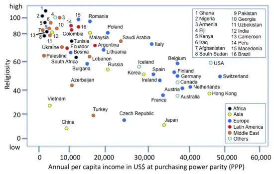 There are an estimated 10,000 distinct religions worldwide,[11] though nearly all of them have regionally based, relatively small followings. Four religions—Christianity, Islam, Hinduism, and Buddhism—account for over 77% of the world's population, and 92% of the world either follows one of those four religions or identifies as nonreligious,[12] meaning that the vast majority of remaining religions account for only 8% of the population combined. The religiously unaffiliated demographic includes those who do not identify with any particular religion, atheists, and agnostics, although many in the demographic still have various religious beliefs.[13] Many world religions are also organized religions, most definitively including the Abrahamic religions Christianity, Islam, and Judaism, while others are arguably less so, in particular folk religions, indigenous religions, and some Eastern religions. A portion of the world's population are members of new religious movements.[14] Scholars have indicated that global religiosity may be increasing due to religious countries having generally higher birth rates.[15]