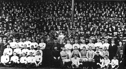 In 1895, a schism in Rugby football resulted in the formation of the Northern Rugby Football Union (NRFU).[12] The success of working class northern teams led to some compensating players who otherwise would be on their job and earning income on Saturdays. This led to the RFU reacting to enforce the amateur principle of the sport, preventing "broken time payments" to players who had taken time off work to play rugby. Northern teams typically had more working class players (coal miners, mill workers etc.) who could not afford to play without this compensation, in contrast to affluent southern teams who had other sources of income to sustain the amateur principle.[2] In 1895, a decree by the RFU banning the playing of rugby at grounds where entrance fees were charged led to twenty-two clubs (including Stockport, who negotiated by telephone) meeting at the George Hotel, Huddersfield, on 29 August 1895 and forming the "Northern Rugby Football Union".[13] Within fifteen years of that first meeting in Huddersfield, more than 200 RFU clubs had left to join the rugby league.