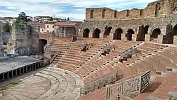 The Greek colonists in Southern Italy, the so-called Magna Graecia, brought theatrical art from their motherland.[40] The Greek Theatre of Syracuse, the Greek Theatre of Segesta, the Greek Theatre of Tindari, the Greek Theatre of Hippana, the Greek Theatre of Akrai, the Greek Theatre of Monte Jato, the Greek Theatre of Morgantina and the most famous Greek Theater of Taormina, amply demonstrate this. Only fragments of original dramaturgical works are left, but the tragedies of the three great giants Aeschylus, Sophocles and Euripides and the comedies of Aristophanes are known.[41] Some famous playwrights in the Greek language came directly from Magna Graecia. Others, such as Aeschylus and Epicharmus, worked for a long time in Sicily. Epicharmus can be considered Syracusan in all respects, having worked all his life with the tyrants of Syracuse. His comedy preceded that of the more famous Aristophanes by staging the gods for the first time in comedy. While Aeschylus, after a long stay in the Sicilian colonies, died in Sicily in the colony of Gela in 456 BC. Epicarmus and Phormis, both of 6th century BC, are the basis, for Aristotle, of the invention of the Greek comedy, as he says in his book on Poetics:[42]